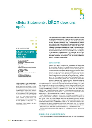 Une personne séropositive ne souffrant d’aucune autre maladie sexuellement transmissible et qui suit un traitement antirétroviral efficace ne transmet pas le virus par le biais de contacts sexuels. Telle est, en janvier 2008, l’affirmation de la Commission fédérale pour les problèmes liés au sida. Cette déclaration, rapidement connue mondialement sous le nom de «Swiss Statement», provoque initialement une vague d’opposition internationale alimentée par la crainte qu’elle sabote les stratégies de prévention actuelles. Deux ans plus tard, aucune conséquence néfaste du «Swiss Statement» n’est constatée. Au contraire, elle a pour mérite d’avoir encouragé des recherches pour des nouvelles méthodes de prévention avec un intérêt grandissant pour le traitement antirétroviral.
