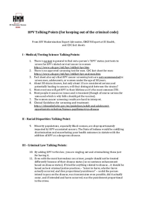 HPV Talking points published by the HIV Modernization Movement-Indiana to support advocacy against bill attempting to add HPV to outdated HIV or STD criminal laws (other than the specific epi/medical/testing facts unique to HPV, many of these talking points would apply to attempts to add any additional communicable diseases to these criminal laws).